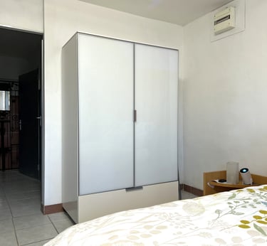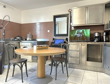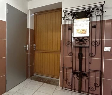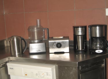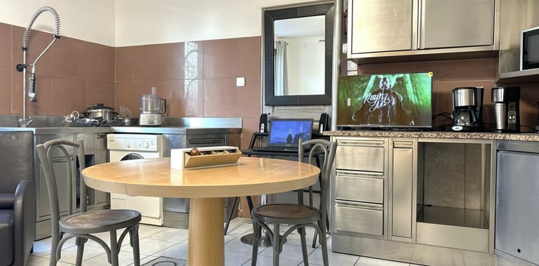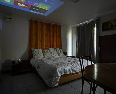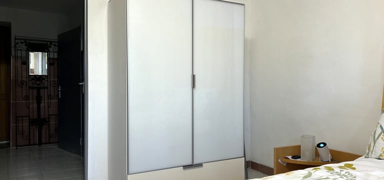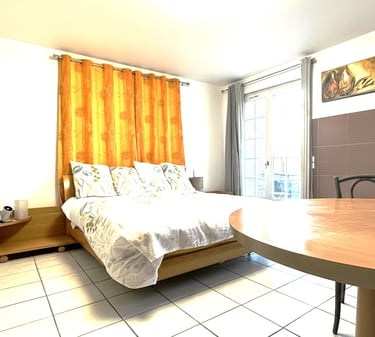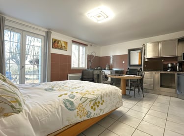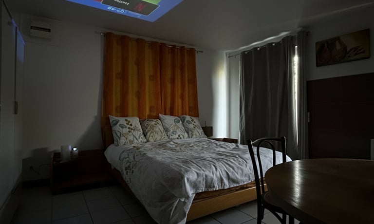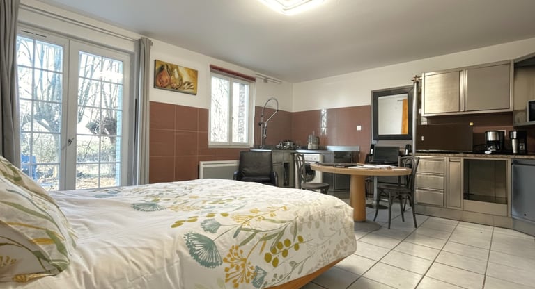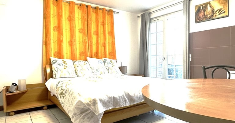 Lit 140 très confortable. Théière, cafetière, grille pain et bouilloire. Le logement est équipé de tout ce que vous utilisez chez vous pour cuisiner. Un robot pâtissier, un robot , un cuit vapeur, un autocuiseur et un lave linge. Nous avons choisi la fonte ainsi que de la porcelaine ancienne.