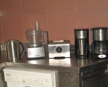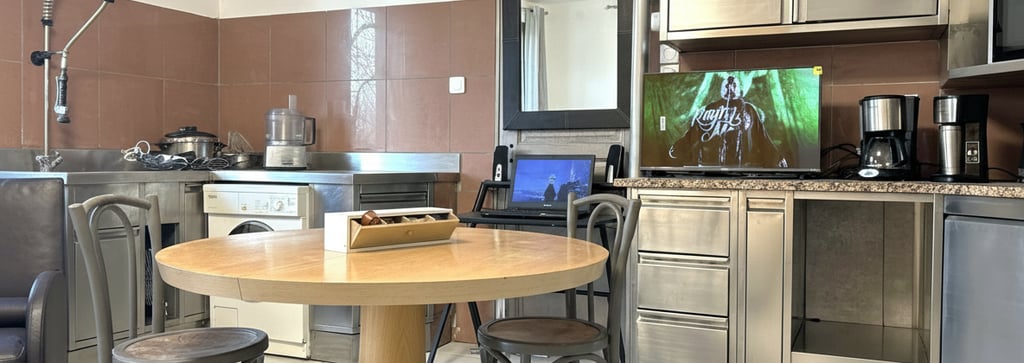 Lit 140 très confortable. Théière, cafetière, grille pain et bouilloire. Le logement est équipé de tout ce que vous utilisez chez vous pour cuisiner. Un robot pâtissier, un robot, un cuit vapeur, un autocuiseur mais aussi un lave linge. Nous avons choisi la fonte ainsi que de la porcelaine ancienne.